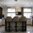 Представленный на фото проект демонстрирует, как можно элегантно и функционально организовать пространство с барной стойкой, которая может служить как дополнительной рабочей поверхностью, так и уютным местом для вечерних посиделок с друзьями. Современное освещение, состоящее из точечных светильников и стильной подвесной люстры, создает идеальную атмосферу для любой ситуации.