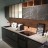 - Деревянные элементы: Открытые полки и стеновая панель под дерево создают контраст с темными фасадами, привнося тепло и природную красоту, а также предлагая дополнительные места для хранения или декора.